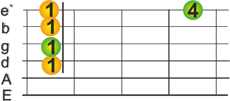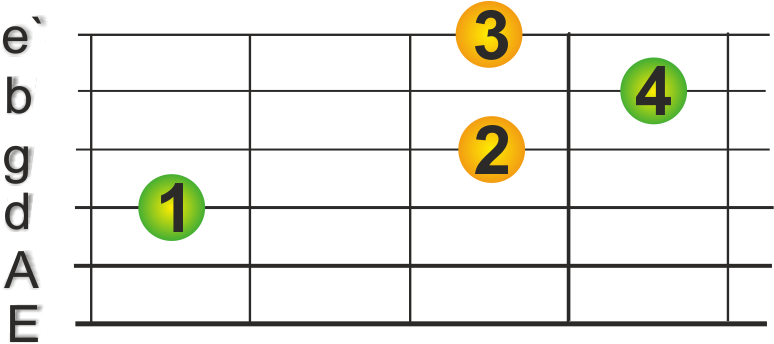 sehr gängige Form. Der Grundton liegt hier auf der E-Saite.