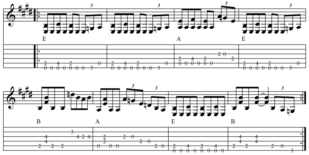 Für die ersten 4 Takte nehmen wir einen typischen Bluesgroove her, in der zweiten Zeile
