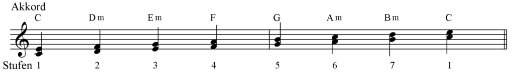 Die Akkorde lauten C-Dur, D Moll, E Moll, F-Dur, G- Dur, A Moll, B Moll.