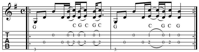Bei den 2 Takten G am Anfang und am Ende spielt man den Riff.