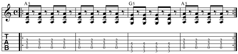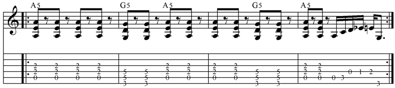 Die Gitarre wird immer nur auf die „glatten“ Zählzeiten 1, 2, 3, 4 gespielt.