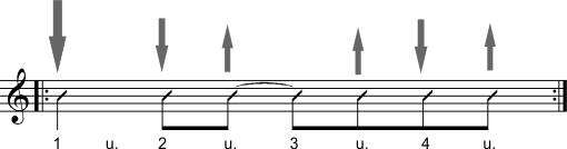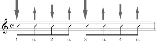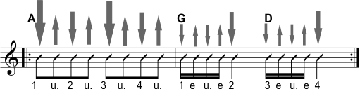 Im Intro wird ein Takt A-Dur in normalen Achtel gespielt. Im 2ten Takt spielt man 16tel-Noten auf die Zählzeiten 1 und 3.